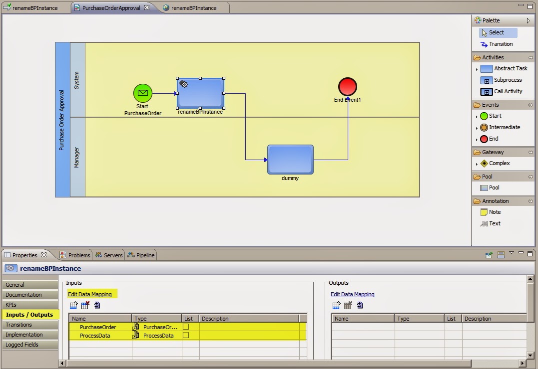 4. Place this service as the first step of the PurchaseOrderApproval process. After opening the process switch to service view and drag the renameBPinstance. Make the connection as shown bellow, select the renameBPInstance activity and click Inputs/Outputs, check that PurchaseOrder and ProcessData documents are there.